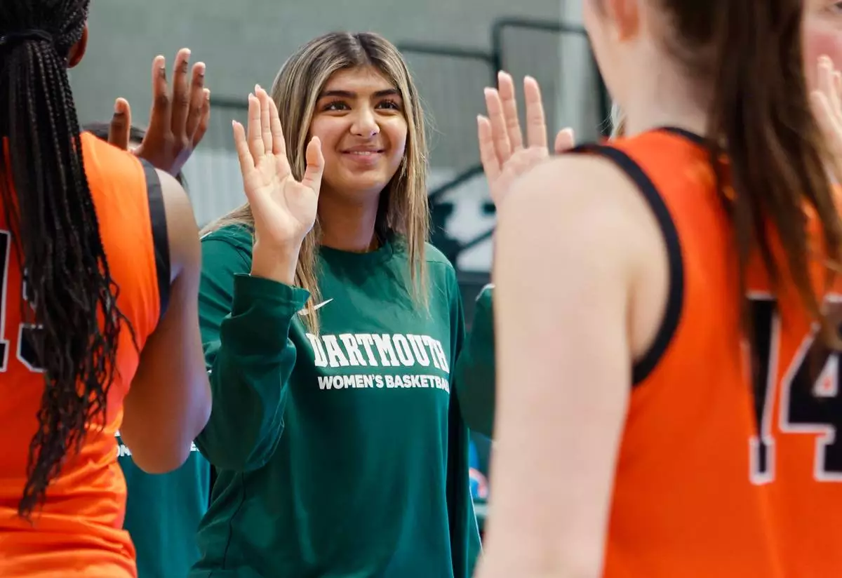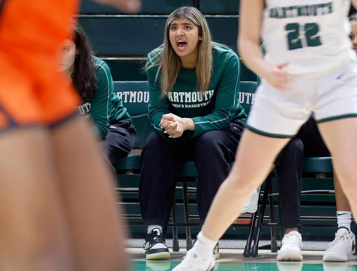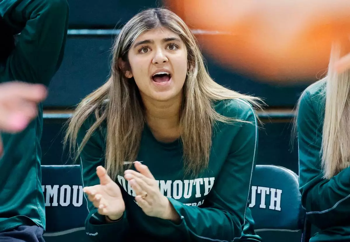 Dartmouth's Annika Jiwani, one of six women from Kobe Bryant’s Mamba Academy going through their first experience with college basketball, cheers her team from the bench during an NCAA college basketball game against Princeton, Saturday, March 1, 2025, in Hanover, N.H. (AP Photo/Mary Schwalm)
