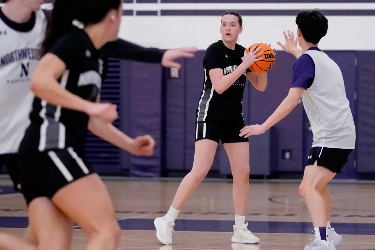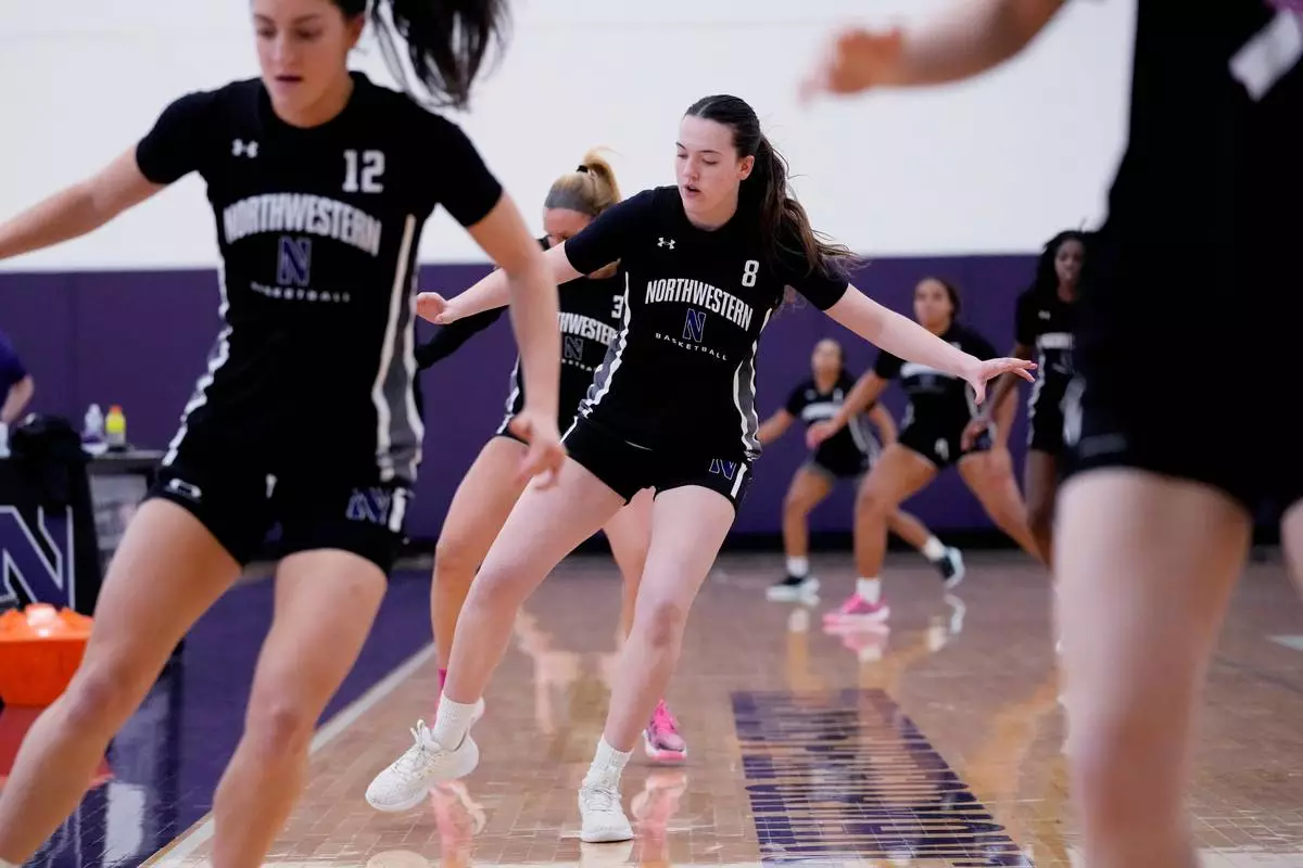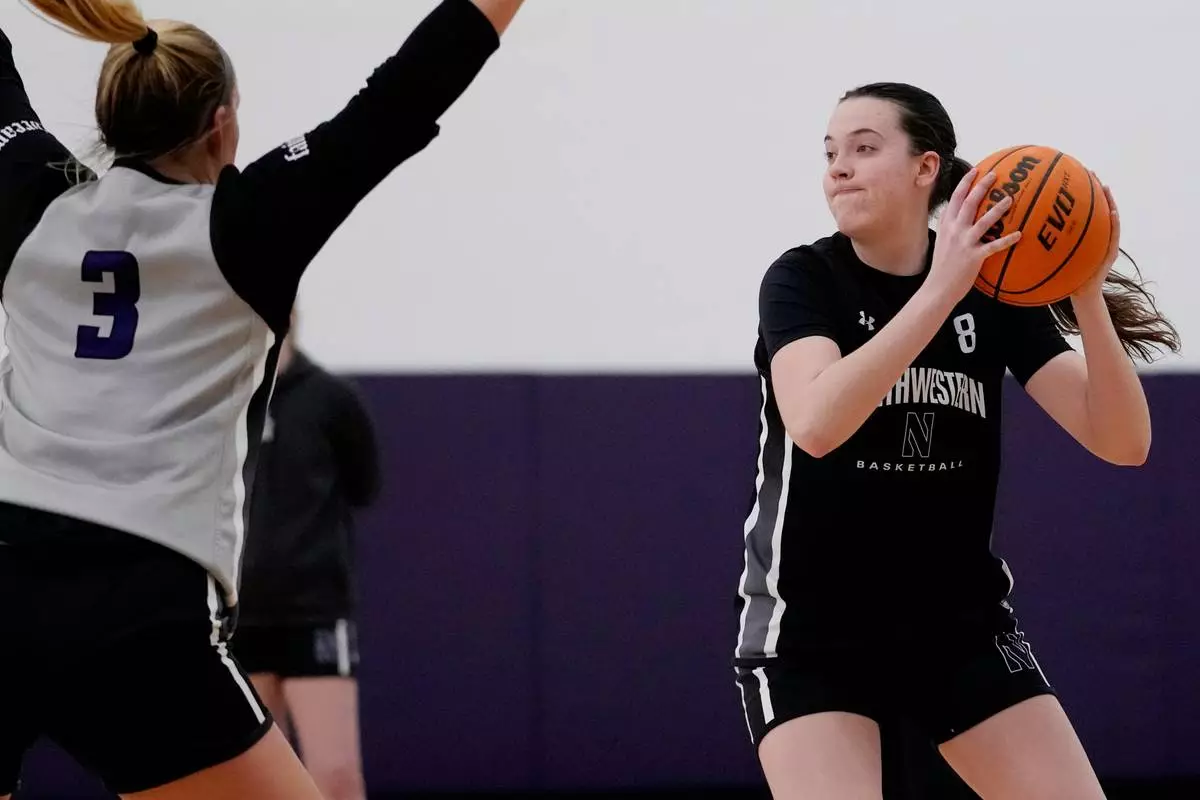 Northwestern freshman Kat Righeimer, one of six women from Kobe Bryant’s Mamba Academy going through their first experience with college basketball, works with teammates during NCAA college basketball practice in Evanston, Ill., Tuesday, Feb. 25, 2025. (AP Photo/Nam Y. Huh)