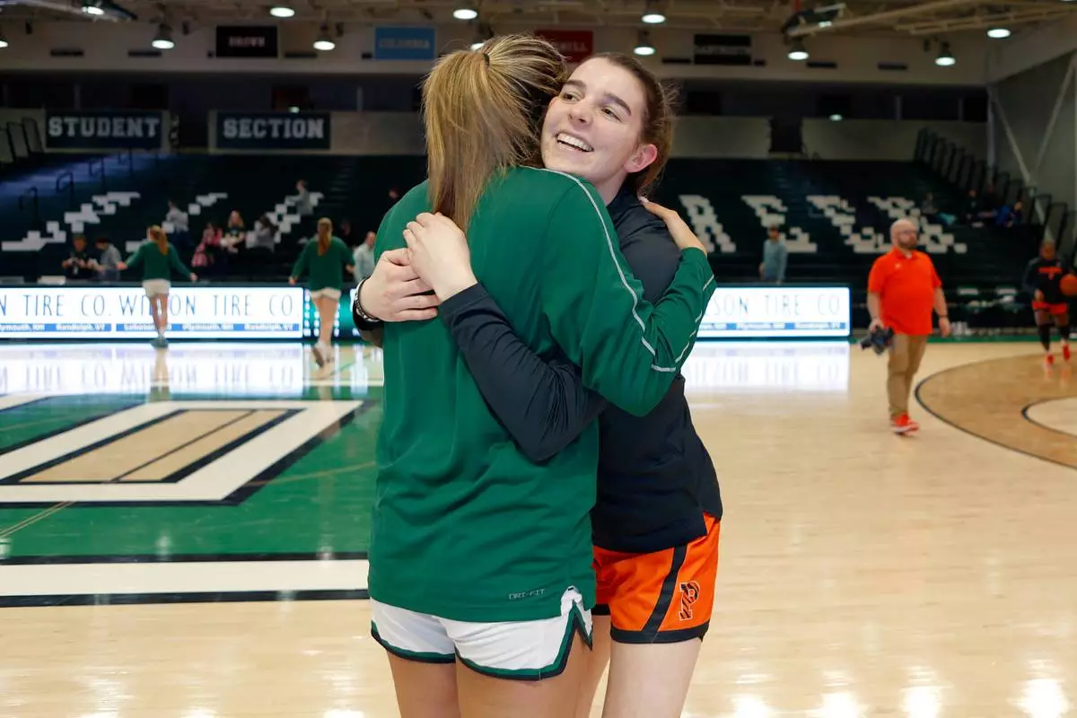 Princeton's Emily Eadie, right, Dartmouth's Annika Jiwani, two of six women from Kobe Bryant’s Mamba Academy going through their first experience with college basketball, hug before an NCAA college basketball game, Saturday, March 1, 2025, in Hanover, N.H. (AP Photo/Mary Schwalm)