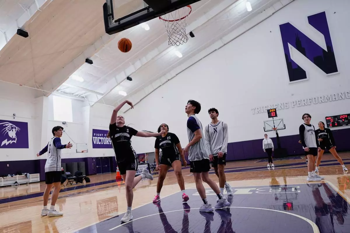 Northwestern freshman Kat Righeimer, second from left, one of six women from Kobe Bryant’s Mamba Academy going through their first experience with college basketball, works with teammates during NCAA college basketball practice in Evanston, Ill., Tuesday, Feb. 25, 2025. (AP Photo/Nam Y. Huh)
