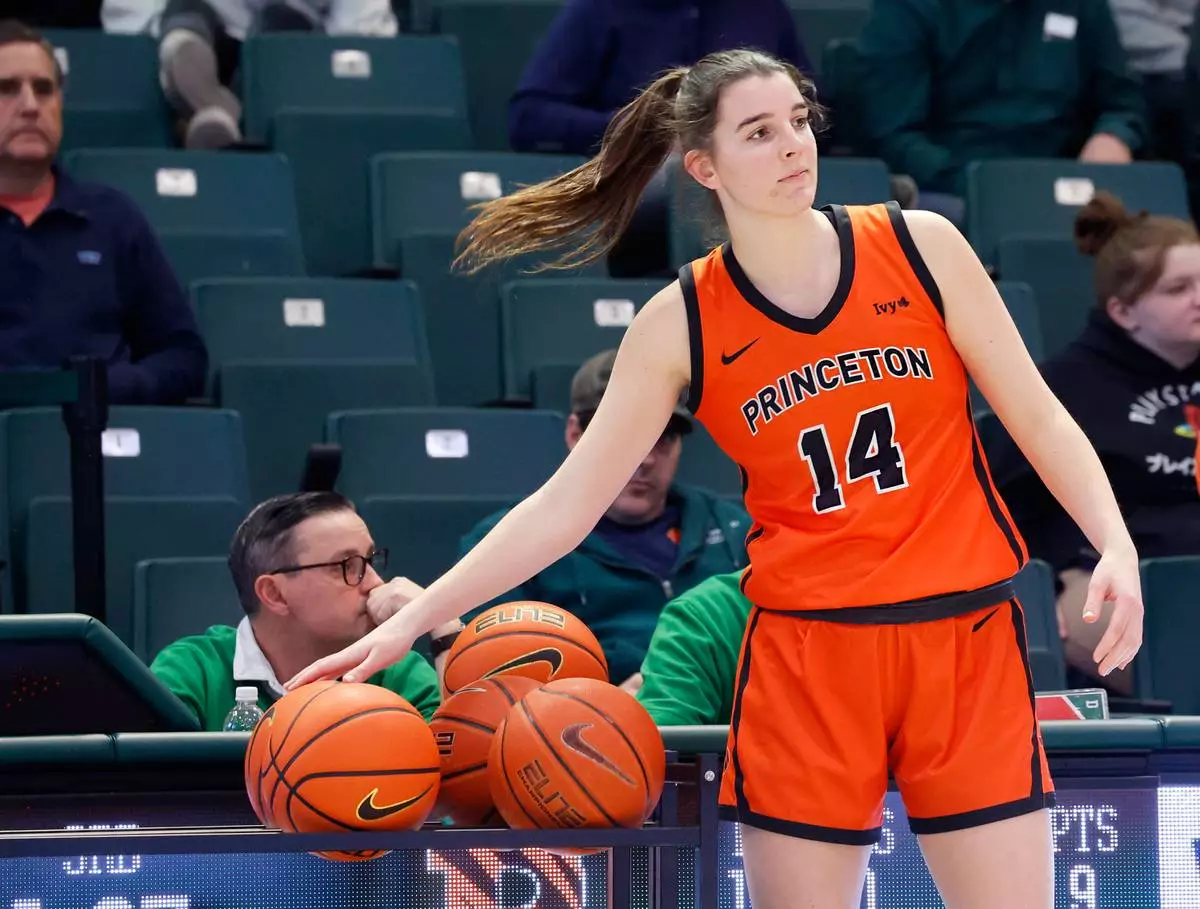 Princeton's Emily Eadie (14), one of six women from Kobe Bryant’s Mamba Academy going through their first experience with college basketball, looks on from a team huddle during the second half of an NCAA college basketball game against Dartmouth, Saturday, March 1, 2025, in Hanover, N.H. (AP Photo/Mary Schwalm)