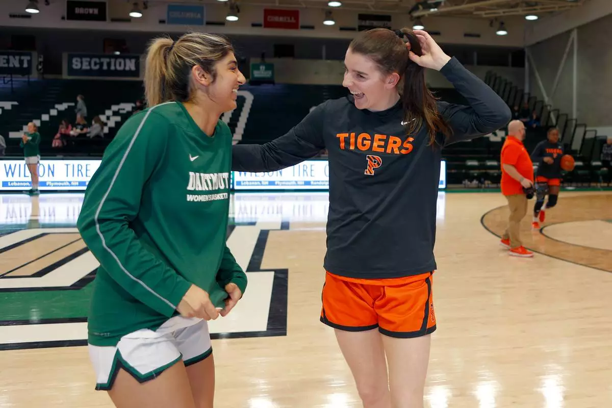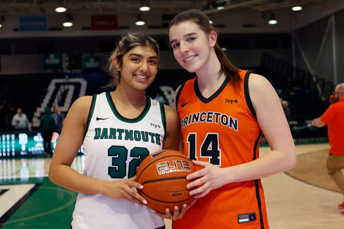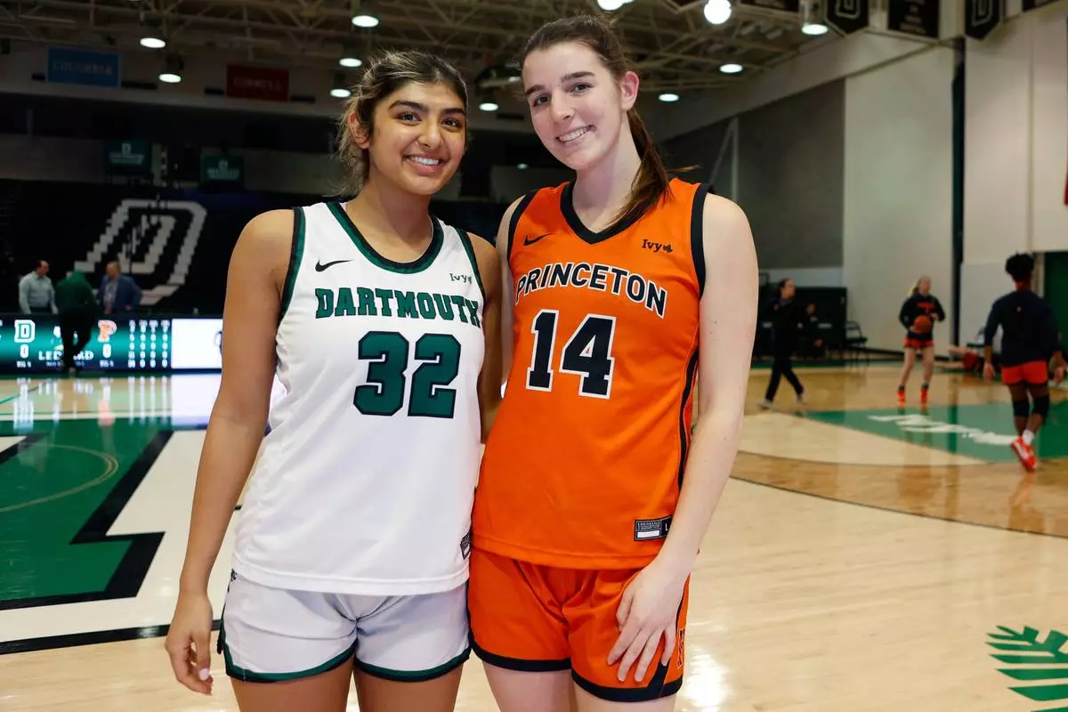 Dartmouth's Annika Jiwani, left, and Princeton's Emily Eadie, two of six women from Kobe Bryant’s Mamba Academy going through their first experience with college basketball, pose before an NCAA college basketball game, Saturday, March 1, 2025, in Hanover, N.H. (AP Photo/Mary Schwalm)