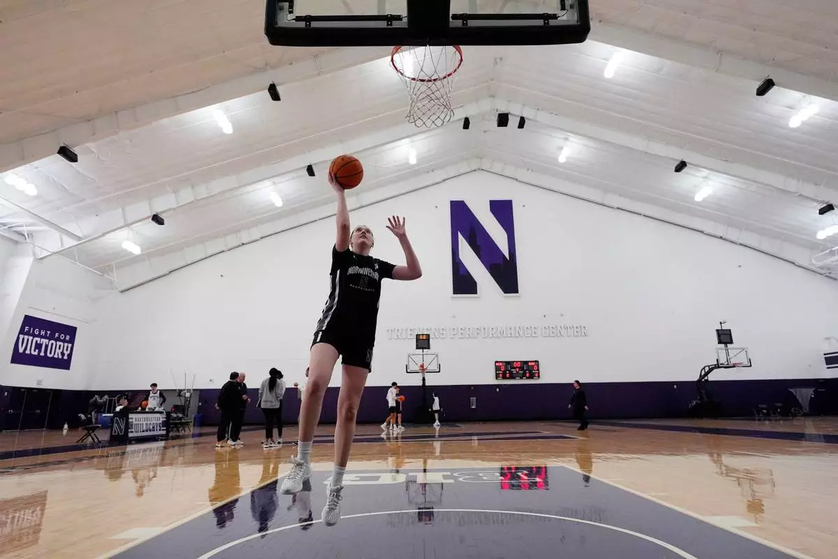 Northwestern freshman Kat Righeimer, one of six women from Kobe Bryant’s Mamba Academy going through their first experience with college basketball, warms up with teammates during NCAA college basketball practice in Evanston, Ill., Tuesday, Feb. 25, 2025. (AP Photo/Nam Y. Huh)