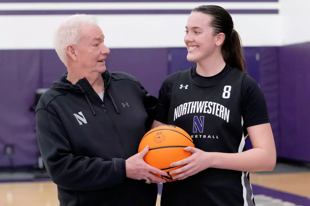 Northwestern women's basketball head coach Joe McKeown, left, talks with freshman Kat Righeimer, one of six women from Kobe Bryant’s Mamba Academy going through their first experience with college basketball, during NCAA college basketball practice in Evanston, Ill., Tuesday, Feb. 25, 2025. (AP Photo/Nam Y. Huh)