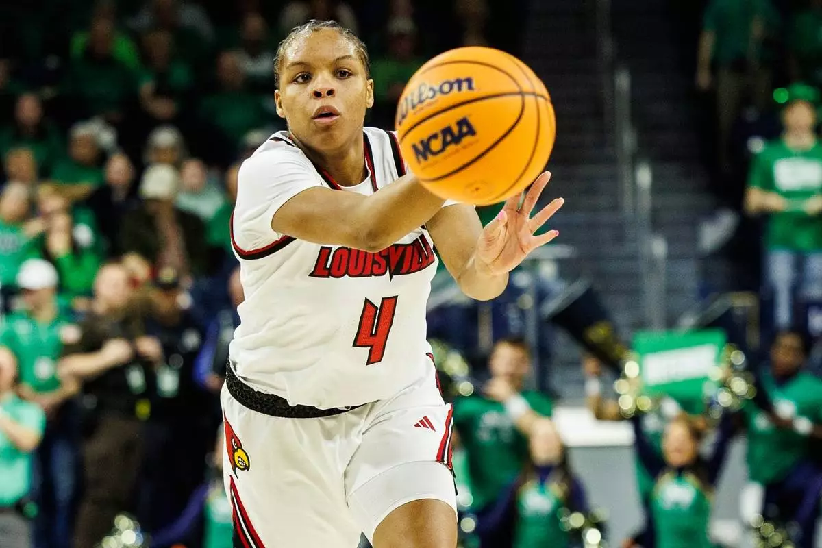 FILE - Louisville forward Mackenly Randolph (4), one of six women from Kobe Bryant’s Mamba Academy going through their first experience with college basketball, passes the ball during the first half of an NCAA college basketball game against Notre Dame, Sunday, March 2, 2025, in South Bend, Ind. (AP Photo/John Mersits, File)