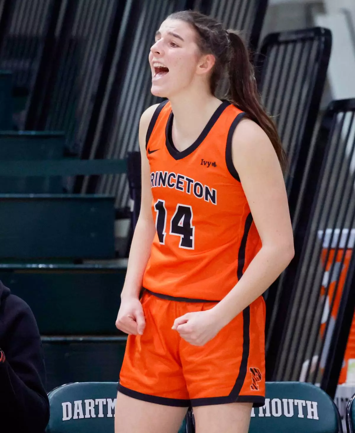 Princeton's Emily Eadie, one of six women from Kobe Bryant’s Mamba Academy going through their first experience with college basketball, cheers her team from the bench during the second half of an NCAA college basketball game against Dartmouth, Saturday, March 1, 2025, in Hanover, N.H. (AP Photo/Mary Schwalm)