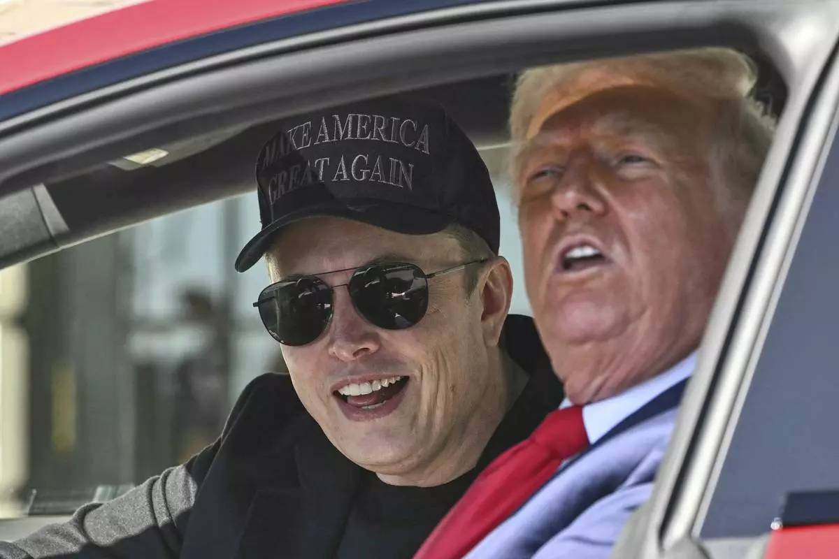 President Donald Trump and Tesla CEO Elon Musk speak to reporters as they sit in a Tesla vehicle on the South Lawn of the White House Tuesday, March 11, 2025, in Washington. (Pool via AP)