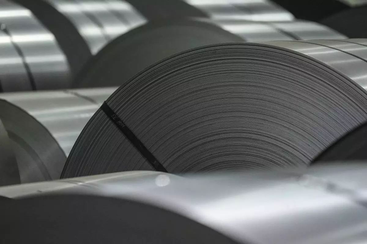 Coils of steel are seen at the ArcelorMittal Dofasco Steel Plant in Hamilton, Ontario, Friday, Feb. 14, 2025. (Chris Young/The Canadian Press via AP)
