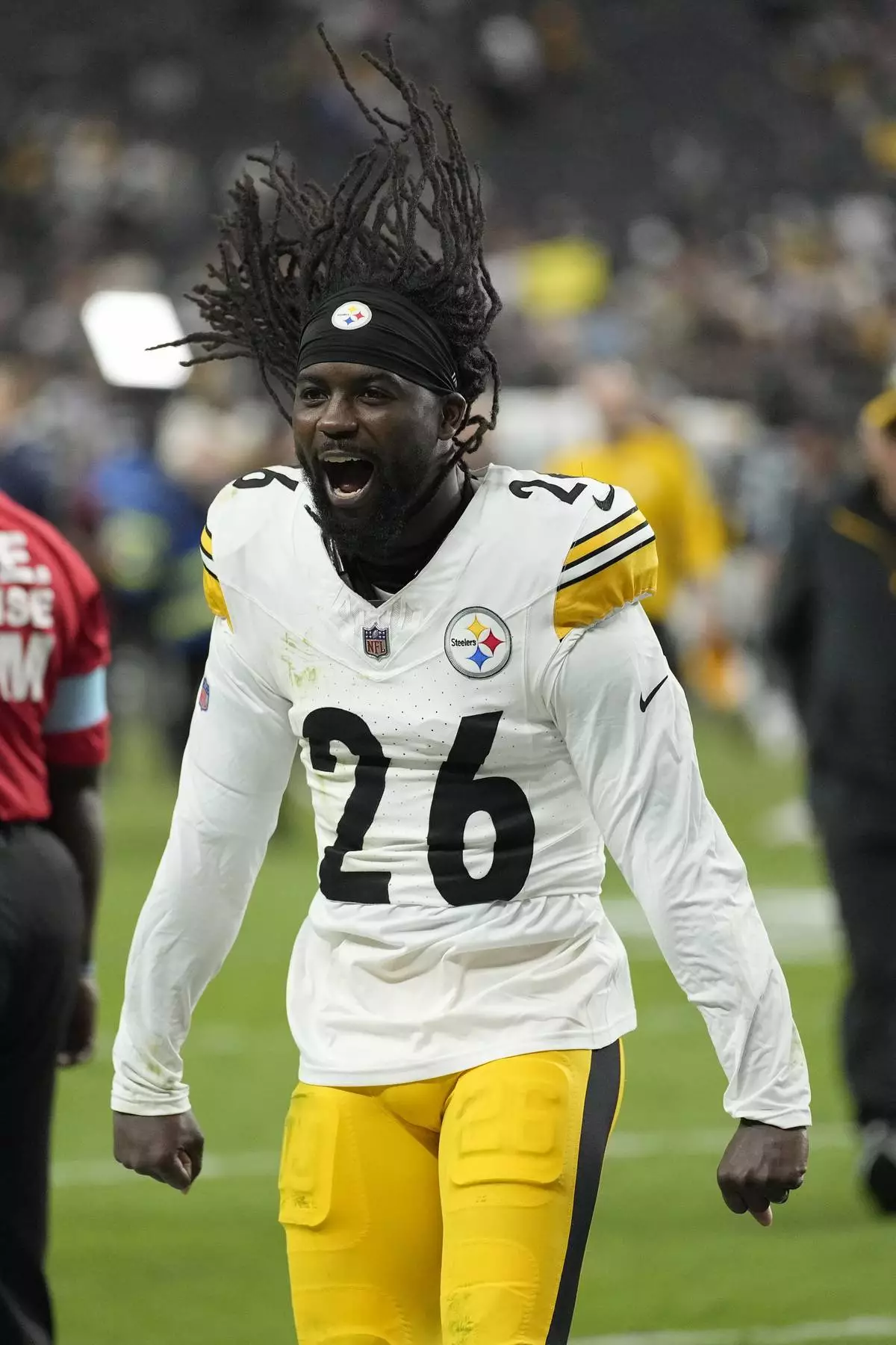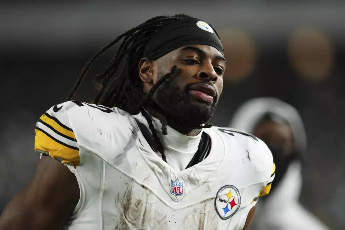 FILE - Pittsburgh Steelers cornerback Donte Jackson (26) celebrates after an NFL football game against the Las Vegas Raiders in Las Vegas, Sunday, Oct. 13, 2024. (AP Photo/John Locher,File)