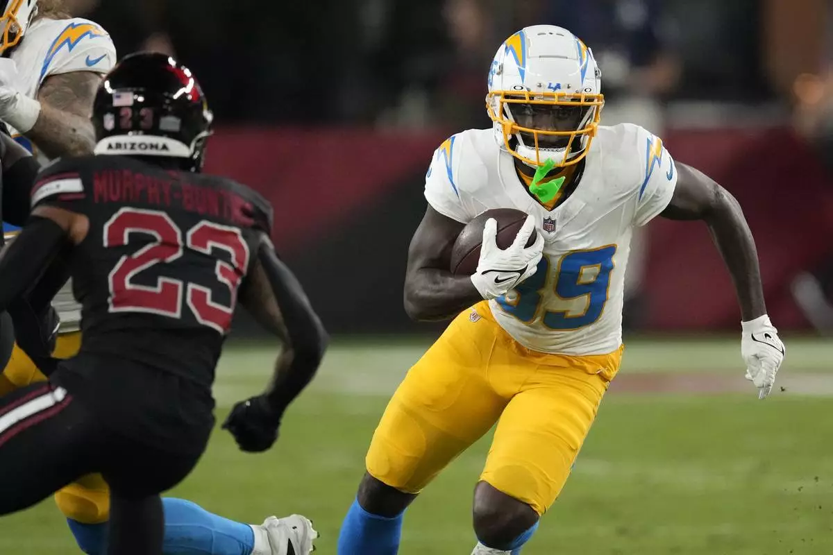 FILE - Los Angeles Chargers wide receiver Jalen Reagor (89) runs from Arizona Cardinals cornerback Sean Murphy-Bunting (23) after catching a pass during the first half of an NFL football game, Monday, Oct. 21, 2024, in Glendale Ariz. (AP Photo/Matt York, File)