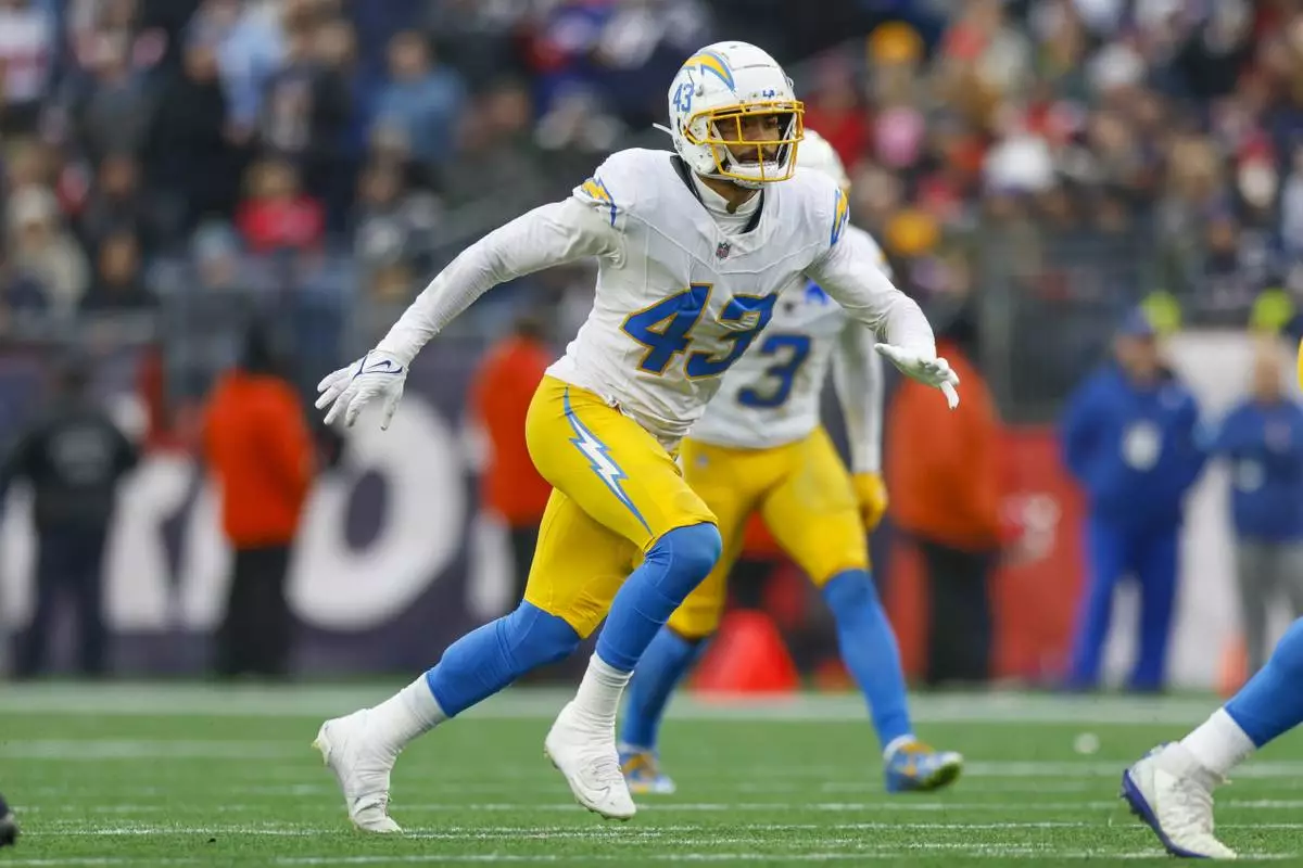 FILE - Los Angeles Chargers linebacker Troy Dye (43) drops into coverage during the second half an NFL football game against the New England Patriots, Saturday, Dec. 28, 2024, in Foxborough, Mass. (AP Photo/Greg M. Cooper, File)