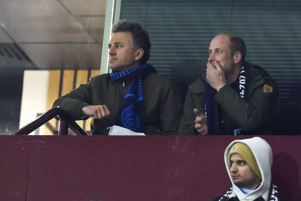 Britain's Prince William, top right, reacts during the Champions League round of 16 second leg soccer match between Aston Villa and Club Brugge at the Villa Park stadium in Birmingham, England, Wednesday, March 12, 2025. (AP Photo/Darren Staples)