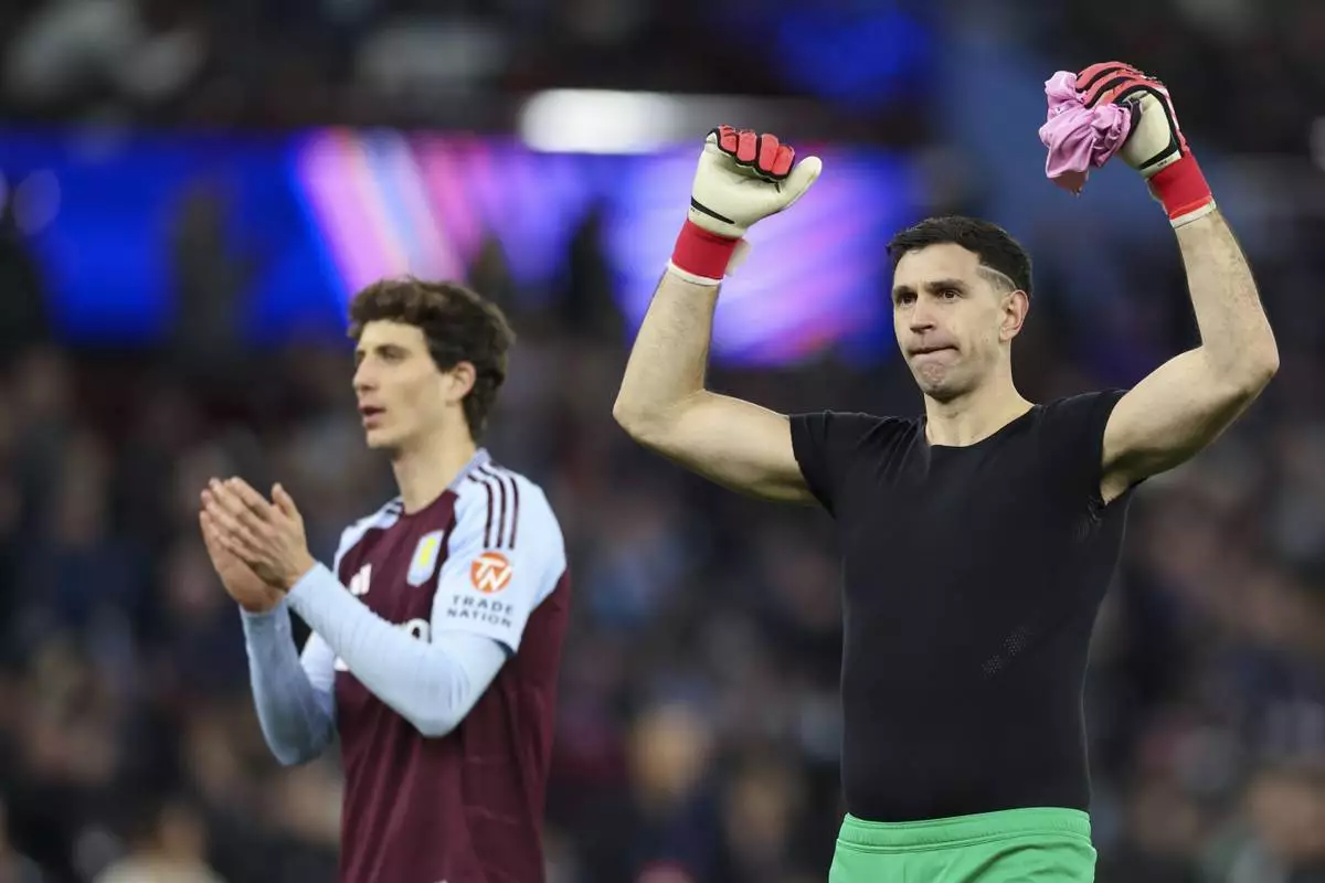 Aston Villa's goalkeeper Emiliano Martinez, right, and Aston Villa's Pau Torres celebrate at the end of the Champions League round of 16 second leg soccer match between Aston Villa and Club Brugge at the Villa Park stadium in Birmingham, England, Wednesday, March 12, 2025. (AP Photo/Darren Staples)