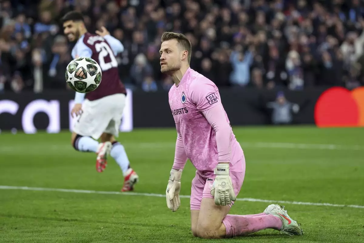 Brugge's goalkeeper Simon Mignolet, front, reacts after Aston Villa's Marco Asensio scoring his side's third goal during the Champions League round of 16 second leg soccer match between Aston Villa and Club Brugge at the Villa Park stadium in Birmingham, England, Wednesday, March 12, 2025. (AP Photo/Darren Staples)