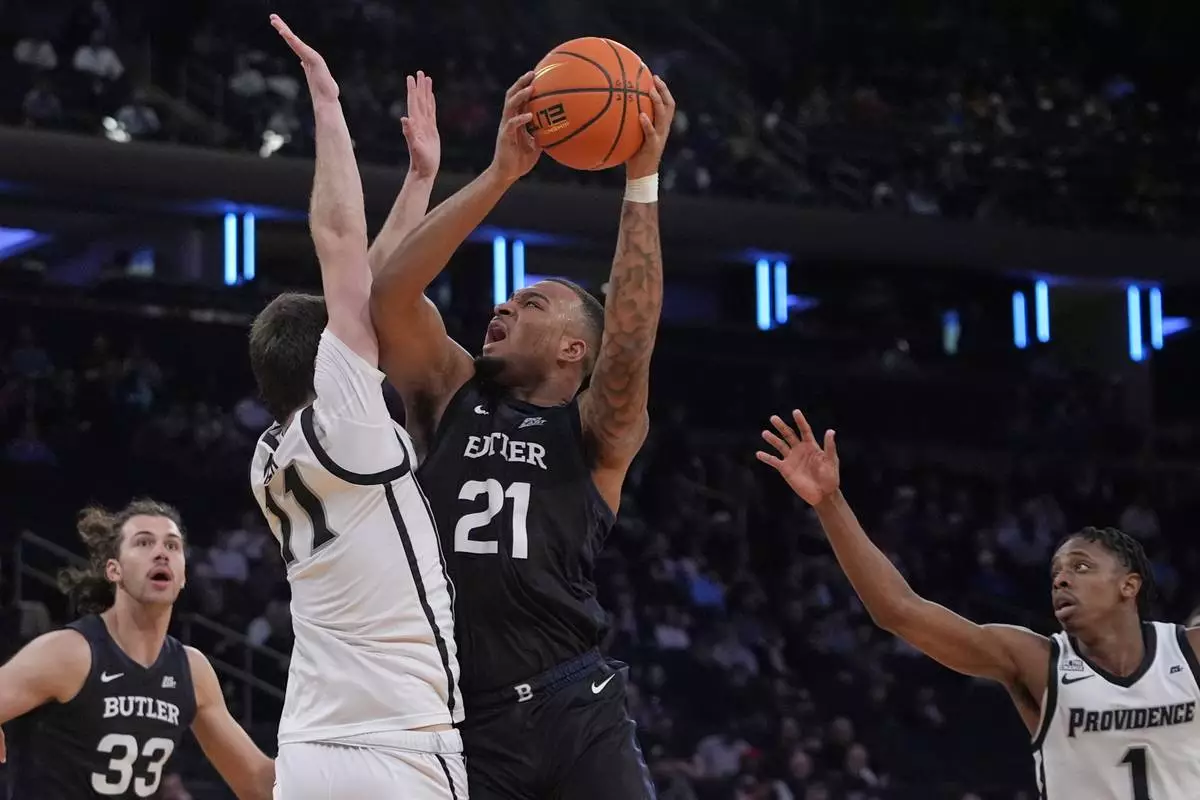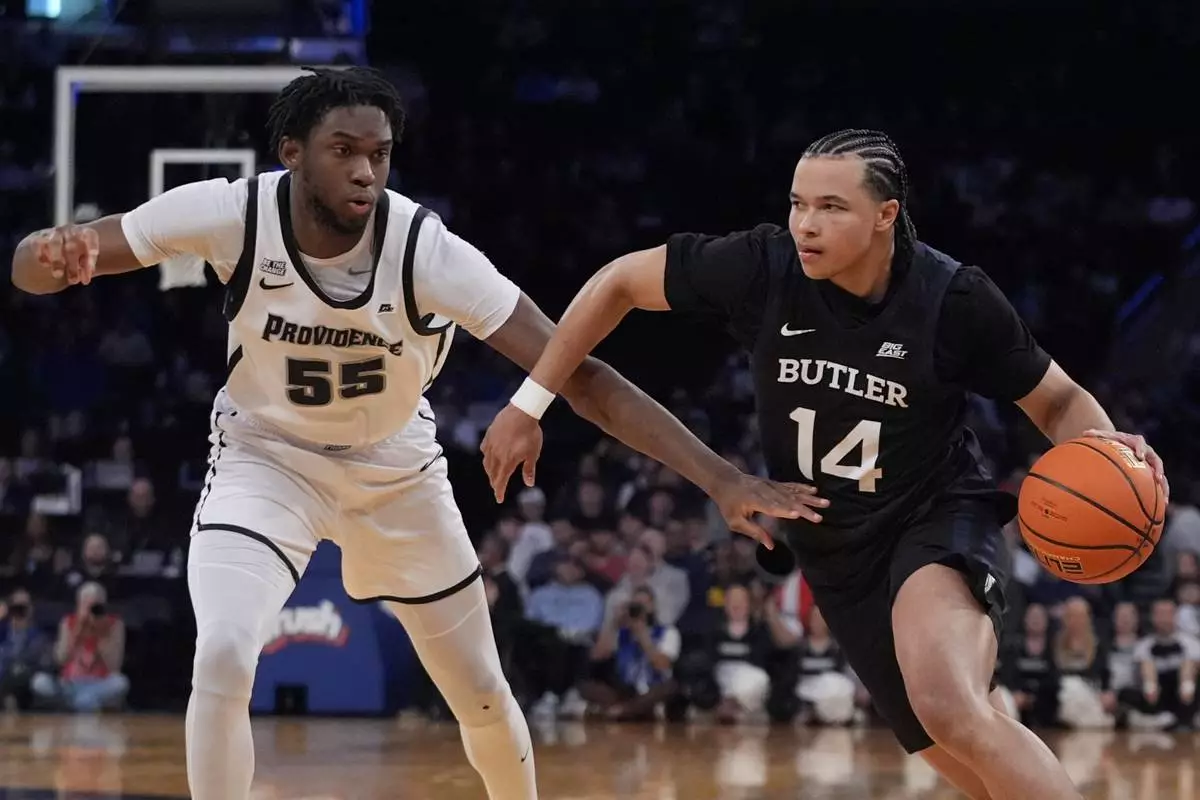 Butler's Landon Moore (14) drives past Providence's Oswin Erhunmwunse (55) during the second half of an NCAA college basketball game at the Big East basketball tournament Wednesday, March 12, 2025, in New York. (AP Photo/Frank Franklin II)