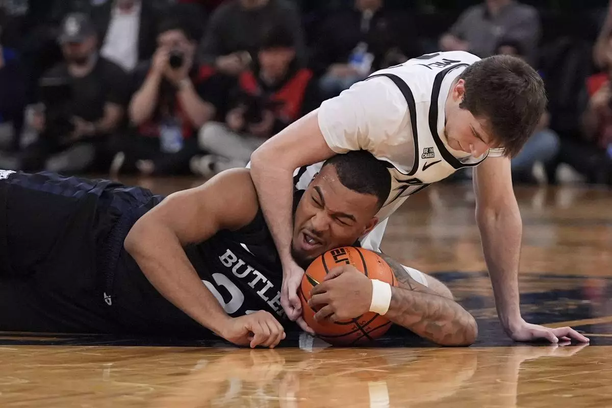 Providence's Ryan Mela, right, fights for control of the ball with Butler's Pierre Brooks II during the second half of an NCAA college basketball game at the Big East basketball tournament Wednesday, March 12, 2025, in New York. (AP Photo/Frank Franklin II)