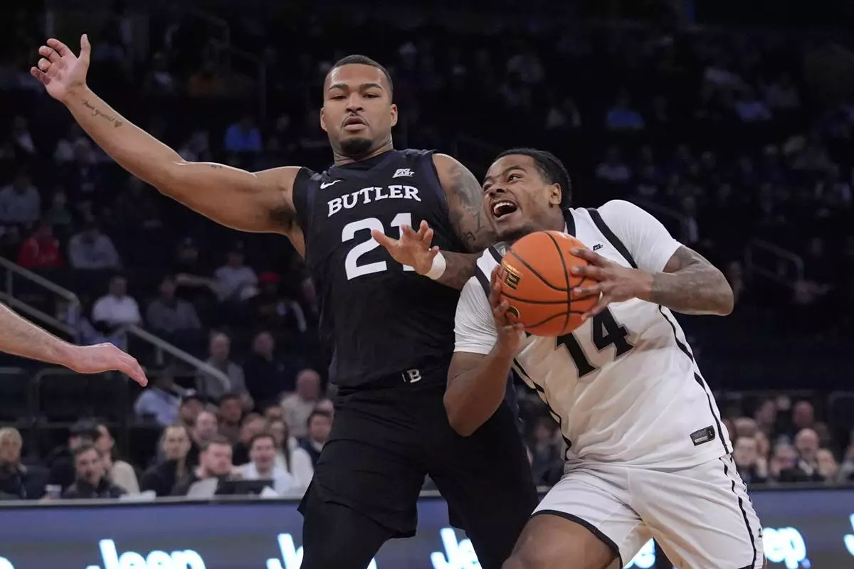 Providence's Corey Floyd Jr. (14) drives pastButler's Dante Maddox Jr. (21) during the first half of an NCAA college basketball game at the Big East basketball tournament Wednesday, March 12, 2025, in New York. (AP Photo/Frank Franklin II)