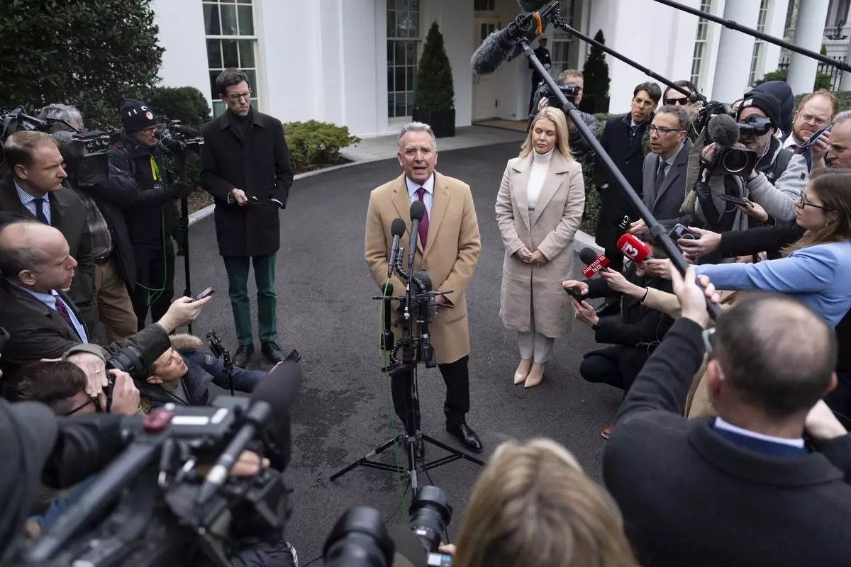FILE - Steve Witkoff, White House special envoy, center, accompanied by White House press secretary Karoline Leavitt, speaks with reporters at the White House in Washington, March 6, 2025. (AP Photo/Ben Curtis, File)