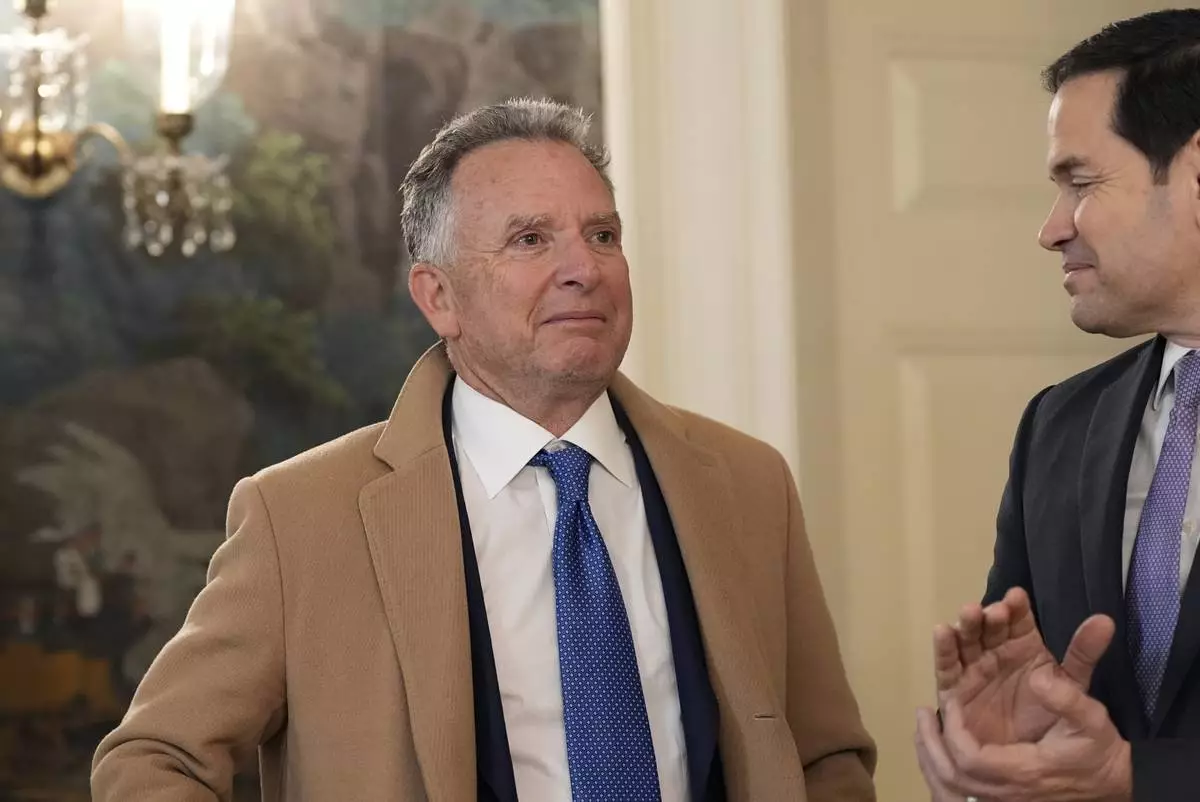 FILE - Steve Witkoff watches as Secretary of State Marco Rubio applauds as President Donald Trump, accompanied by Marc Fogel, speak in the Diplomatic Reception Room at the White House, Feb. 11, 2025, in Washington. (AP Photo/Alex Brandon, File)