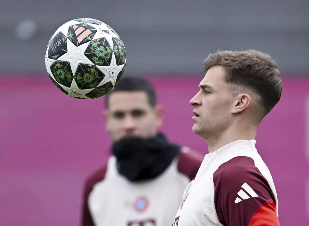 FC Bayern Munich's Joshua Kimmich attends a training session at the Sabener Strasse training ground in Munich, Germany, Monday March 10, 2025, ahead of their Champions League match against Bayer Leverkusen on Tuesday. (Sven Hoppe/dpa via AP)