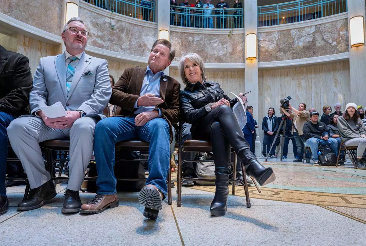 From left, Economic Development Secretary Rob Black, actor Emilio Estevez and New Mexico Gov. Michelle Lujan Grisham take part in Film and Media Day at the Legislature, Thursday, March 13, 2025, in Santa Fe, N.M. (Eddie Moore/The Albuquerque Journal via AP)