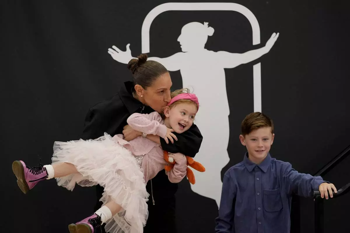 Former Phoenix Mercury player Diana Taurasi kisses daughter Isla, as son Leo Michael looks on after her retirement news conference, Thursday, March 13, 2025, in Phoenix. (AP Photo/Matt York)