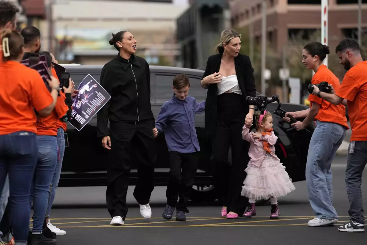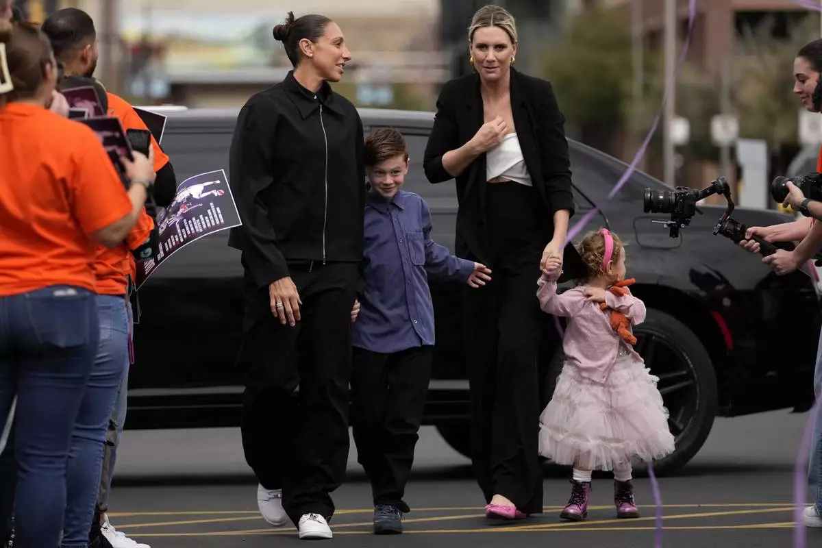 Former Phoenix Mercury player Diana Taurasi, left, arrives for her retirement news conference with wife, Penny Taylor, and their children Leo Michael, and Isla, right, Thursday, March 13, 2025, in Phoenix. (AP Photo/Matt York)