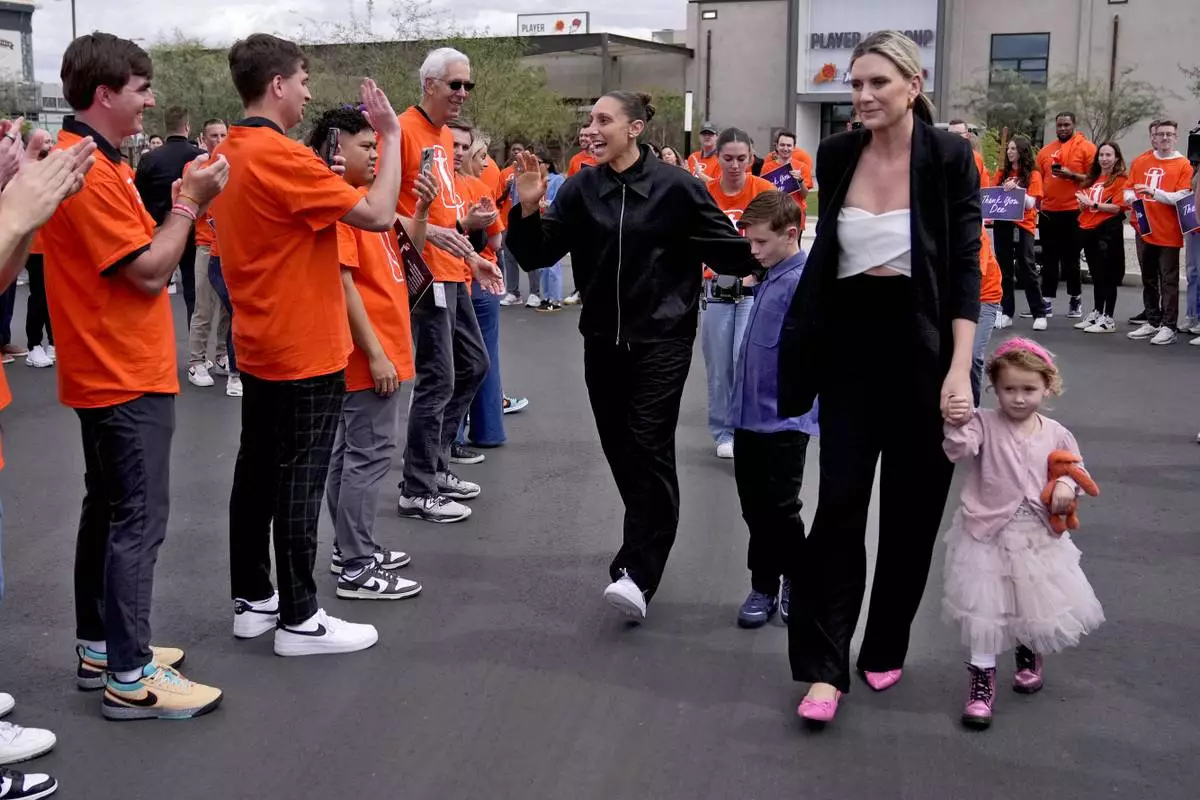 Former Phoenix Mercury player Diana Taurasi, left, greets Mercury employees as she arrives for her retirement news conference with wife, Penny Taylor, and their children Leo Michael, and Isla, right, Thursday, March 13, 2025, in Phoenix. (AP Photo/Matt York)