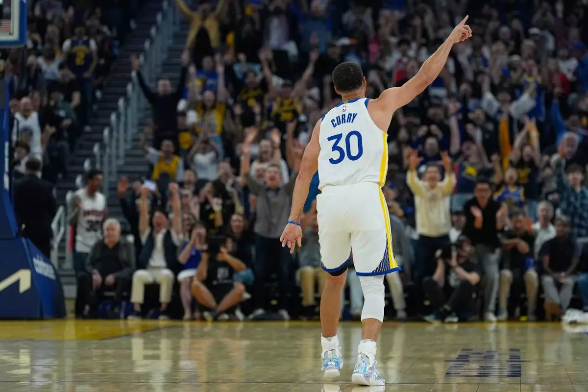 Golden State Warriors guard Stephen Curry celebrates after making a 3-point basket during the first half of an NBA basketball game against the Houston Rockets, Sunday, April 5, 2026, in San Francisco. (AP Photo/Godofredo A. Vásquez)