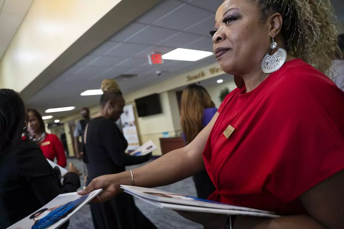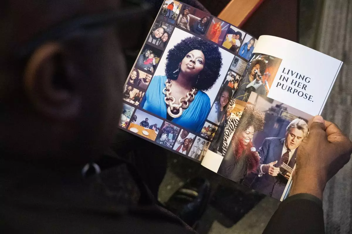 An attendee flips through the program at the memorial service for singer and actress Angie Stone, Friday, March 14, 2025, in Austell. Ga. (AP Photo/Olivia Bowdoin)