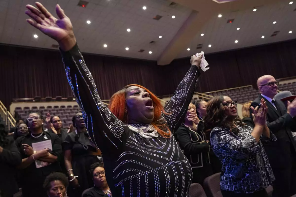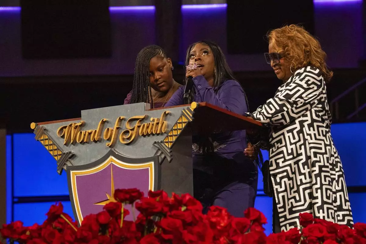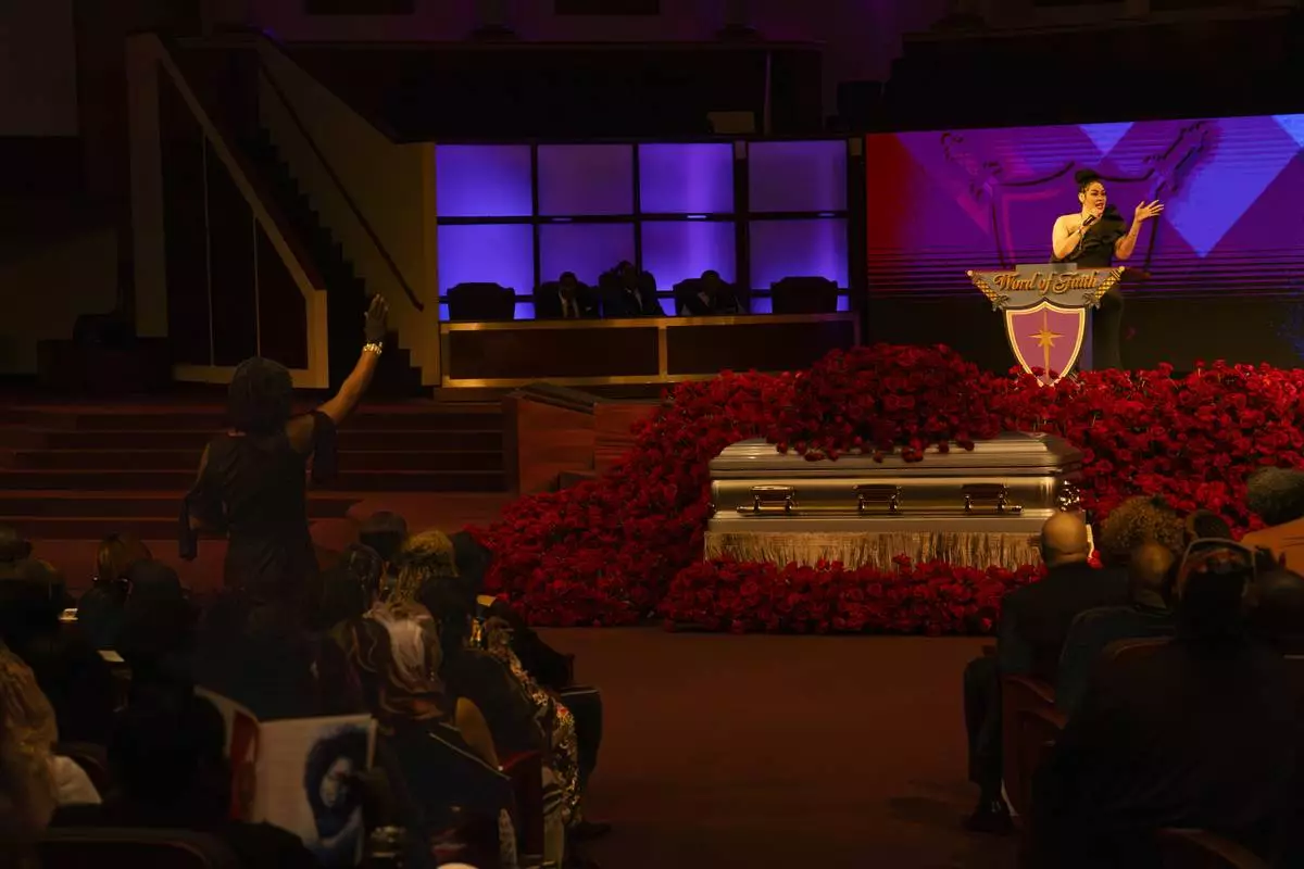 Mourners filed into the massive Word of Faith Cathedral west of Atlanta, taking their seats around a silver and gold casket surrounded by a sea of red roses.