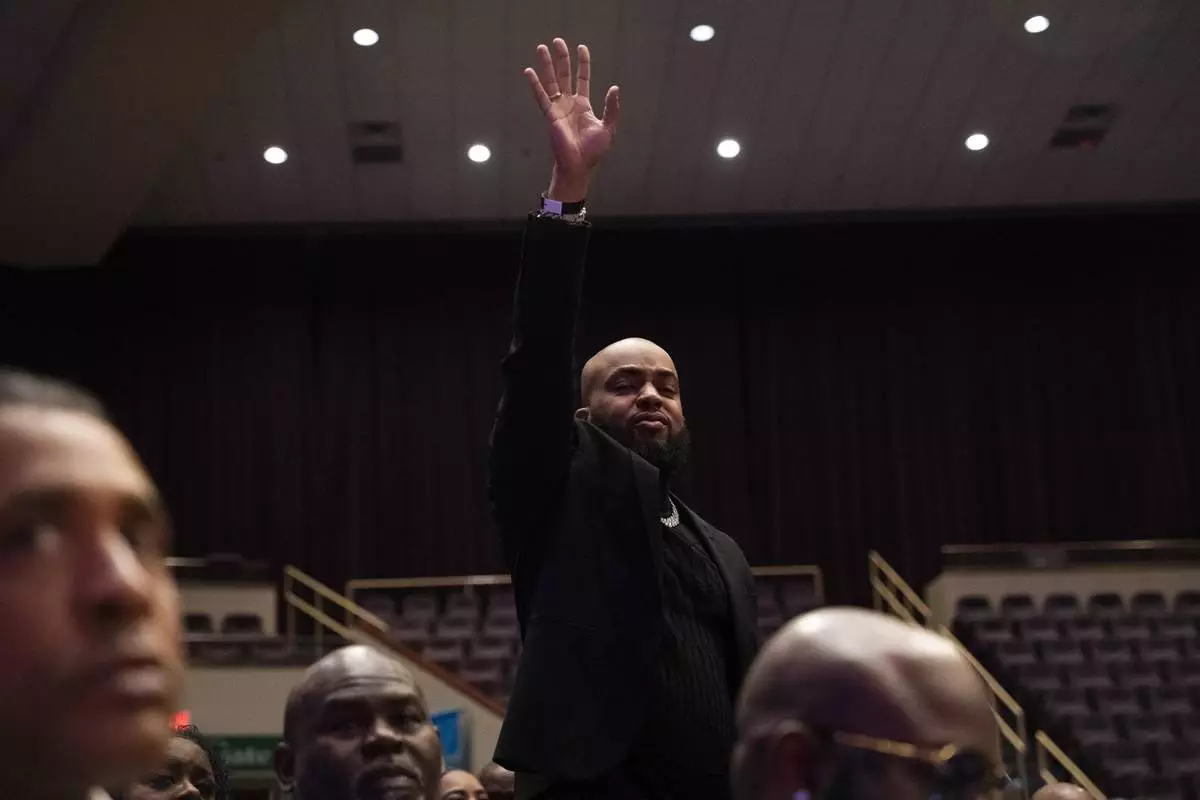 Renowned Gospel Music singer, Kirk Franklin, performs at the memorial service for singer and actress Angie Stone, Friday, March 14, 2025, in Austell. Ga. (AP Photo/Olivia Bowdoin)