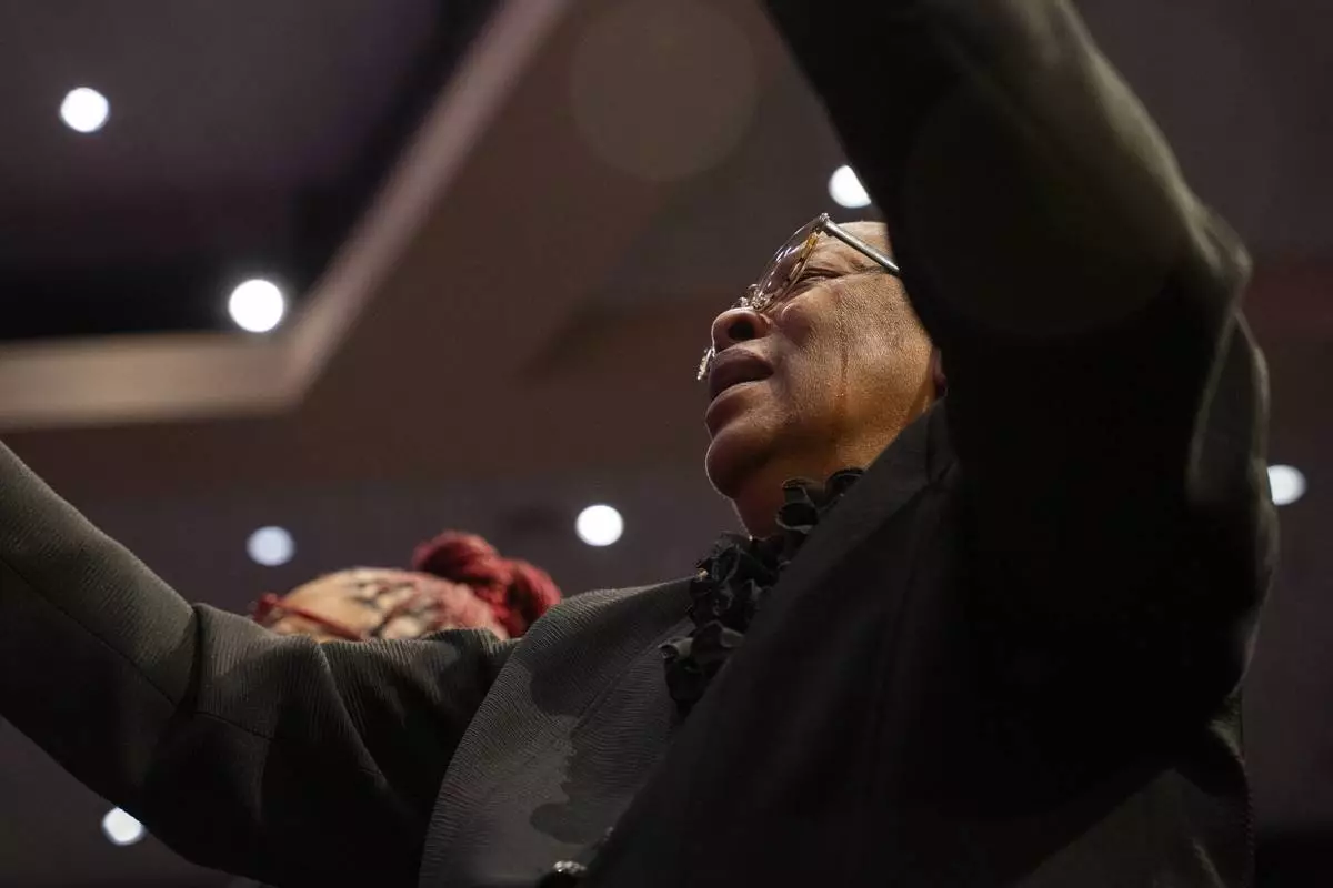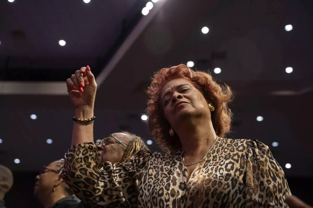 Fans and friends gather to celebrate the life of singer and actress Angie Stone, Friday, March 14, 2025, in Austell. Ga. (AP Photo/Olivia Bowdoin)