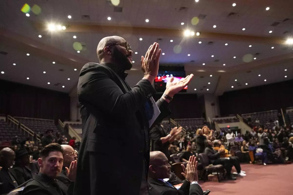 Tyler Perry stands and applauds at the memorial service for singer and actress Angie Stone, Friday, March 14, 2025, in Austell. Ga. (AP Photo/Olivia Bowdoin)