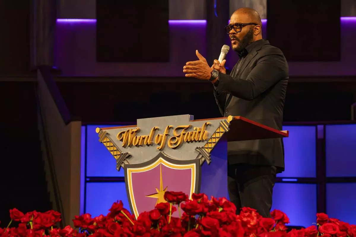 Tyler Perry speaks at the memorial service for singer and actress Angie Stone, Friday, March 14, 2025, in Austell. Ga. (AP Photo/Olivia Bowdoin)