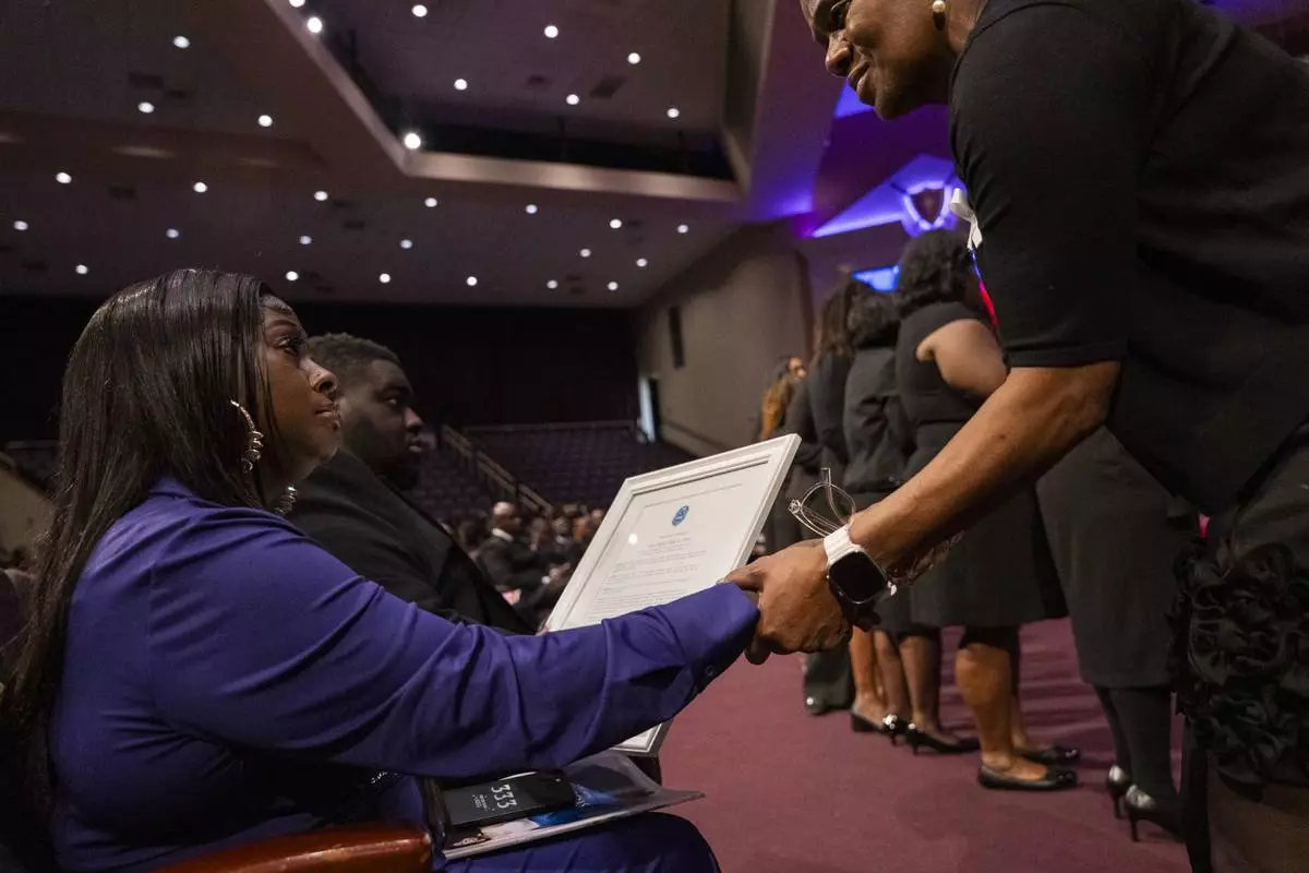 Diamond, daughter of Angie Stone, receives a plaque in honor of her mother at a memorial service, Friday, March 14, 2025, in Austell. Ga. (AP Photo/Olivia Bowdoin)