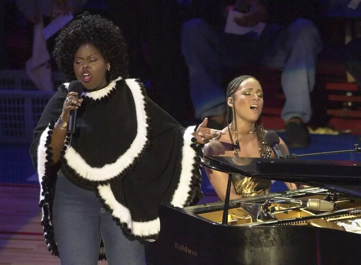FILE - Alicia Keys, right, and Angie Stone, perform "America the Beautiful" during the NBA All-Star game in Philadelphia, Feb. 10, 2002. (AP Photo/Dan Loh, file)