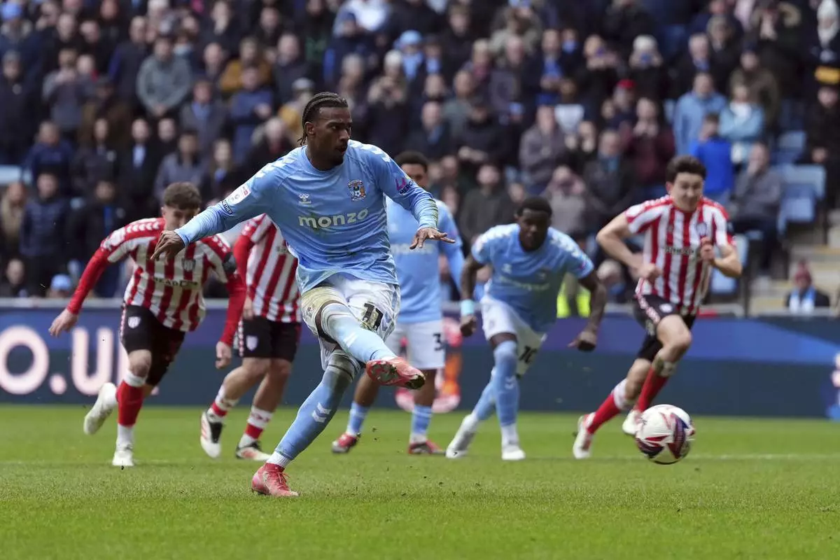 Coventry City's Haji Wright scores their side's second goal of the game from the penalty spot during a Sky Bet Championship soccer match against Sunderland, Saturday, March 15, 2025, at Coventry Building Society Arena in Coventry, England. (Bradley Collyer/PA via AP)