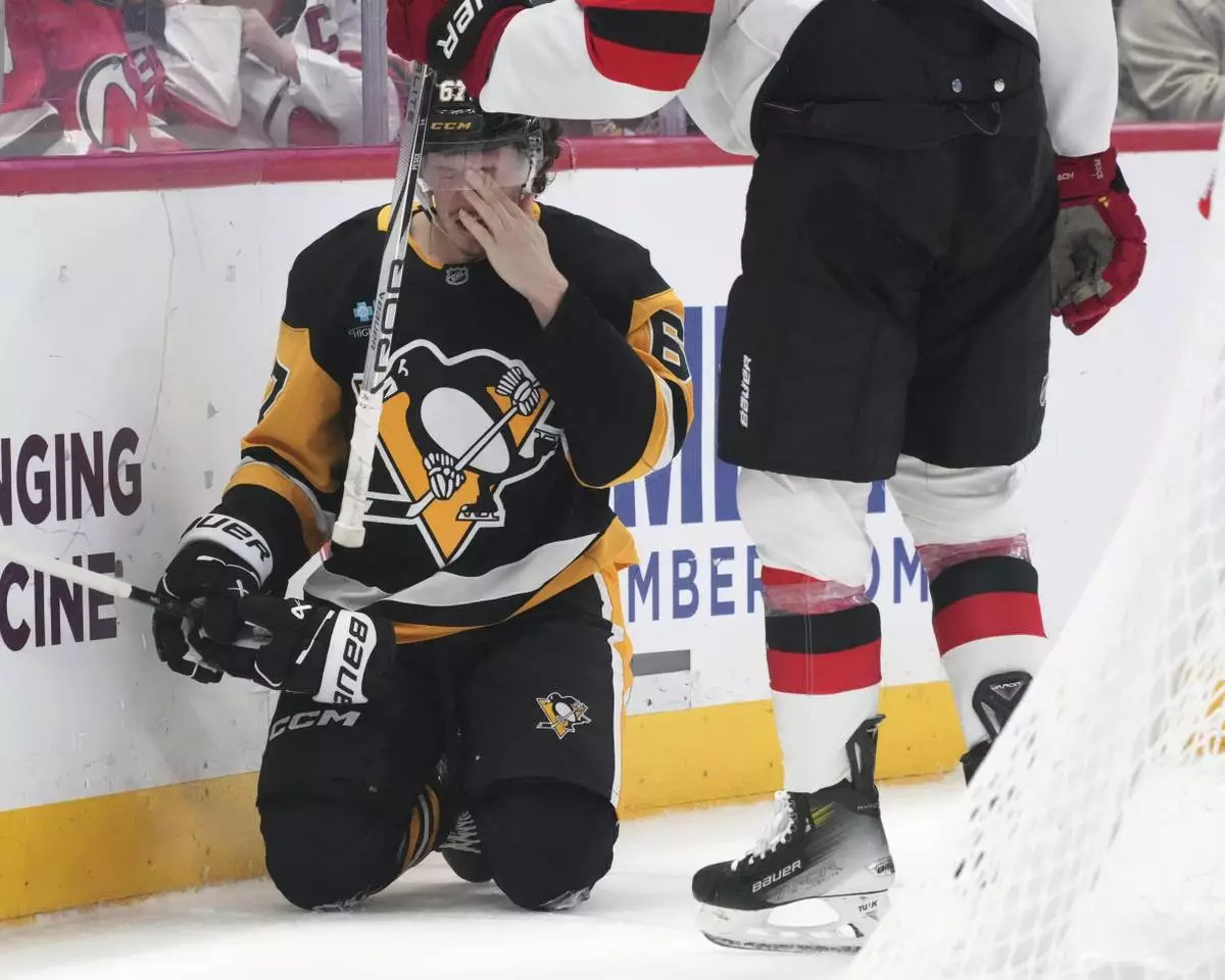 Pittsburgh Penguins' Rickard Rakell (67) reacts to getting hit by a high stick from New Jersey Devils' Brett Pesce, right, during the second period of an NHL hockey game in Pittsburgh, Saturday, March 15, 2025. (AP Photo/Gene J. Puskar)
