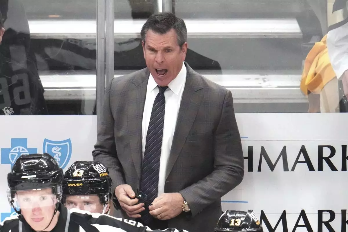 Pittsburgh Penguins head coach Mike Sullivan stands behind his bench during the third period of an NHL hockey game against the Vegas Golden Knights in Pittsburgh, Tuesday, March 11, 2025. (AP Photo/Gene J. Puskar)