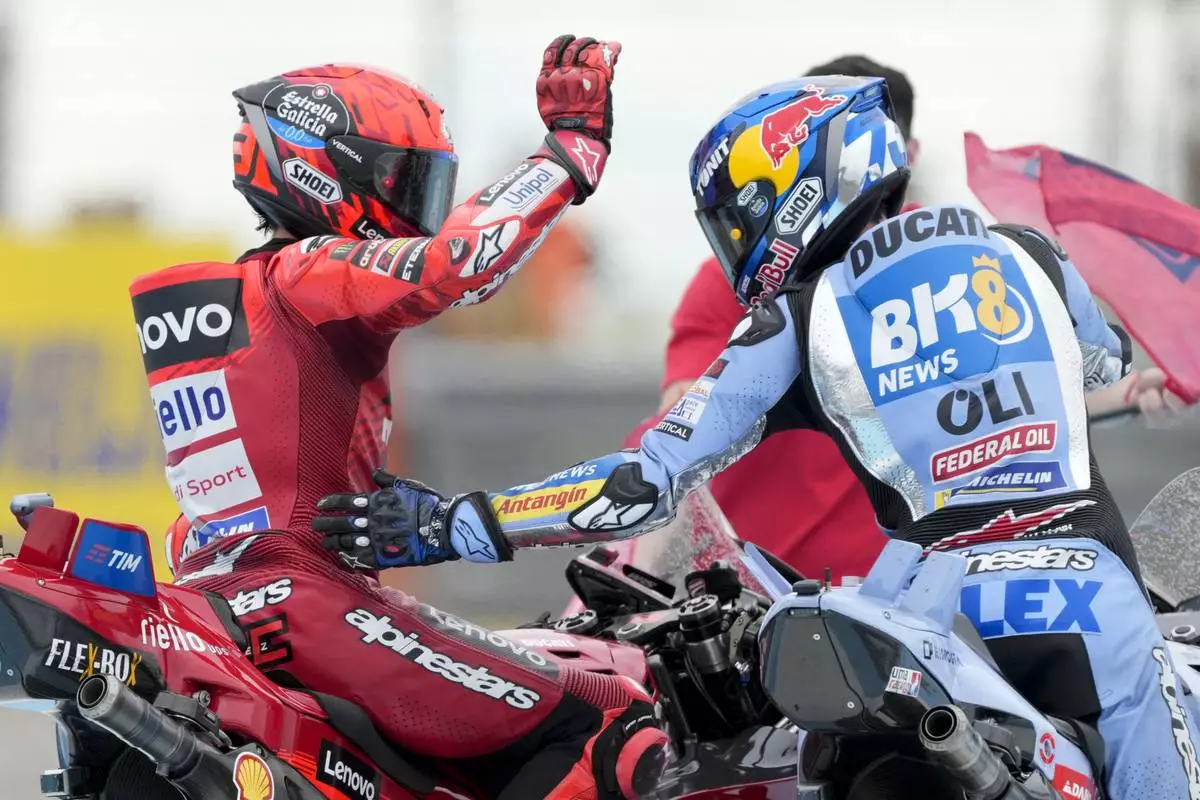 MotoGP race winner Spain's Marc Marquez of the Ducati Lenovo Team, right, celebrates with second place Spain's Alex Marquez of the BK8 Gresini Racing MotoGP Team in Termas de Rio Hondo circuit, Argentina, Sunday, March 16, 2025. (AP Photo/Gustavo Garello)