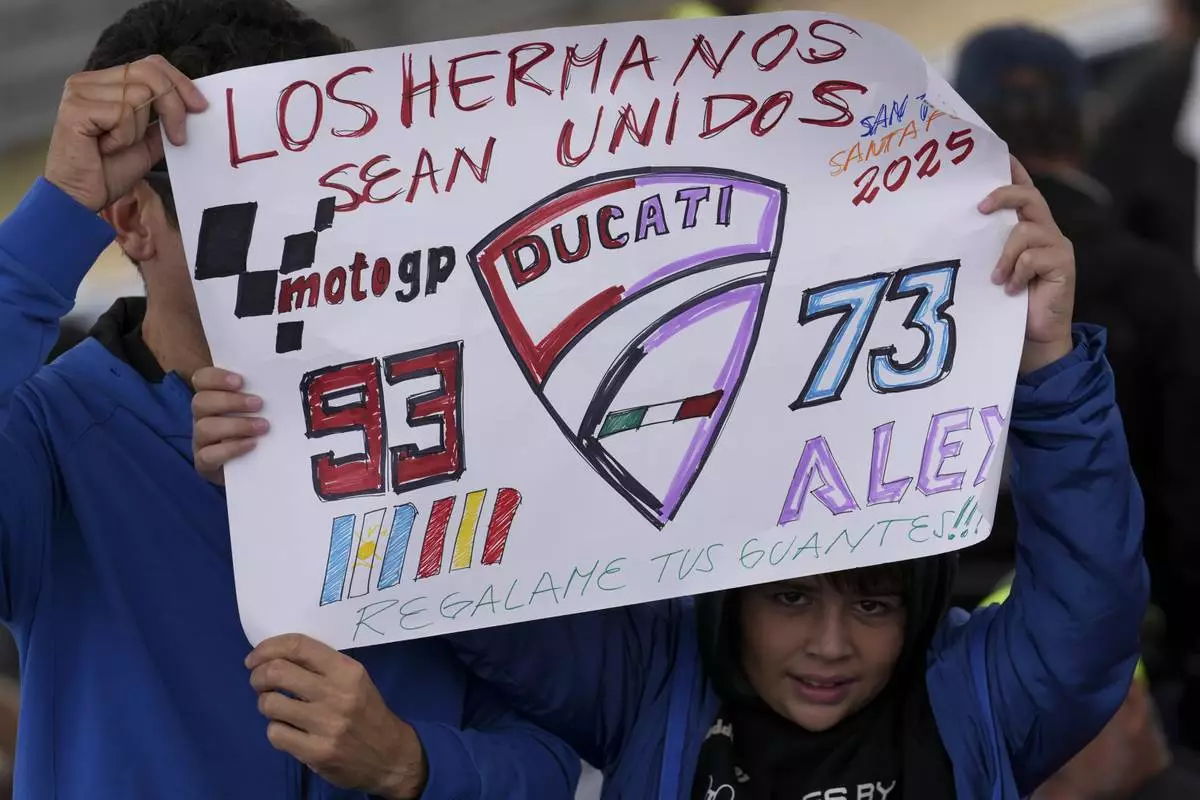 A spectator holds a banner reading in Spanish "Brothers, be united" in reference to MotoGP competitors Marc Marquez and Alex Marquez, both of Spain, in Termas de Rio Hondo, Argentina, Sunday, March 16, 2025. (AP Photo/Gustavo Garello)