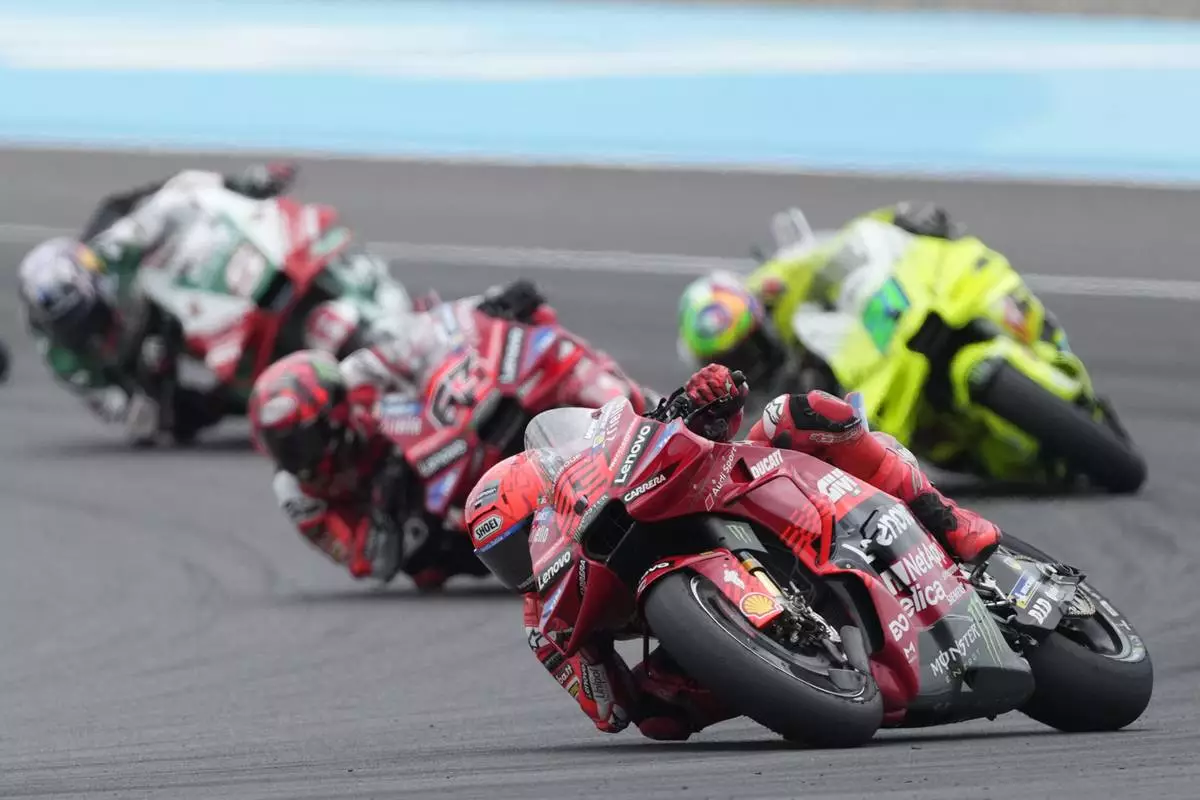 Spain's Marc Marquez of the Ducati Lenovo Team competes during the Moto GP race in Termas de Rio Hondo circuit, Argentina, Sunday, March 16, 2025. (AP Photo/Gustavo Garello)