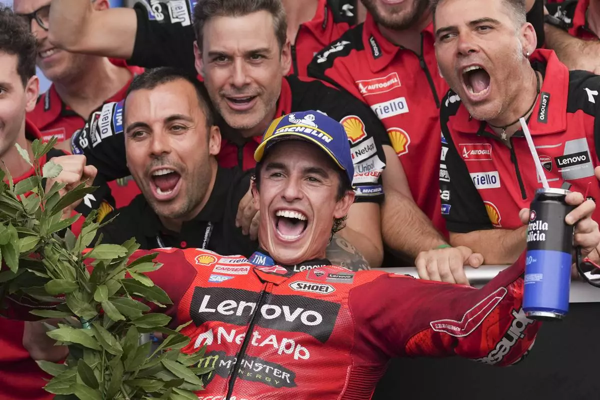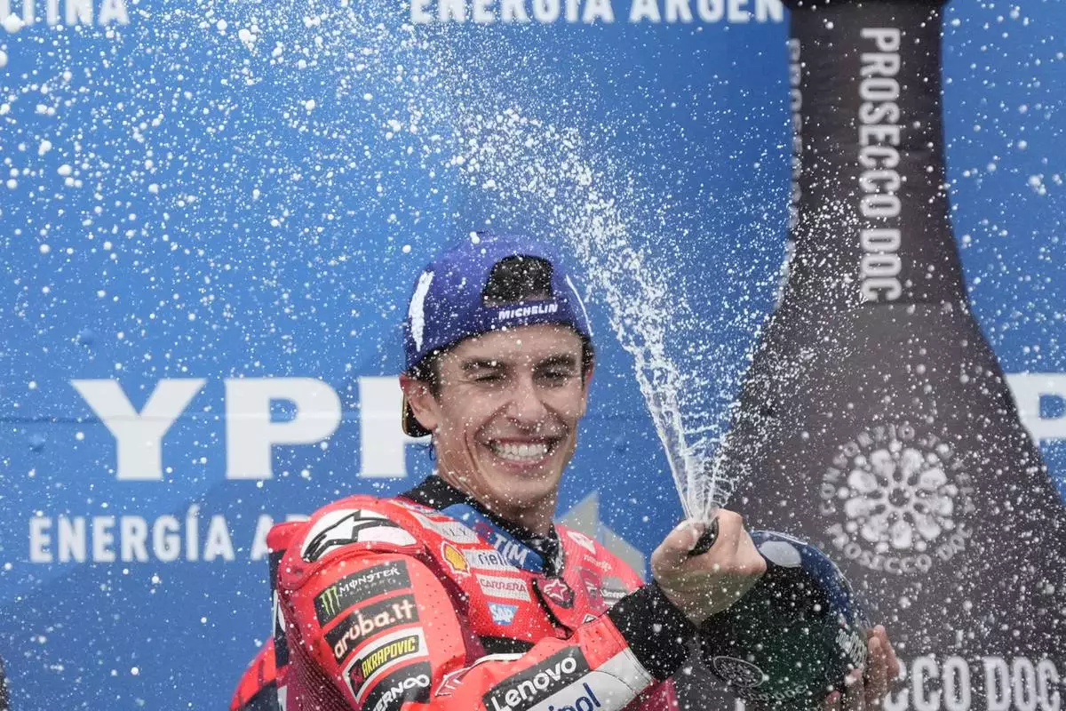 Spain's Marc Marquez of the Ducati Lenovo Team celebrates winning the MotoGP race in Termas de Rio Hondo circuit, Argentina, Sunday, March 16, 2025. (AP Photo/Gustavo Garello)