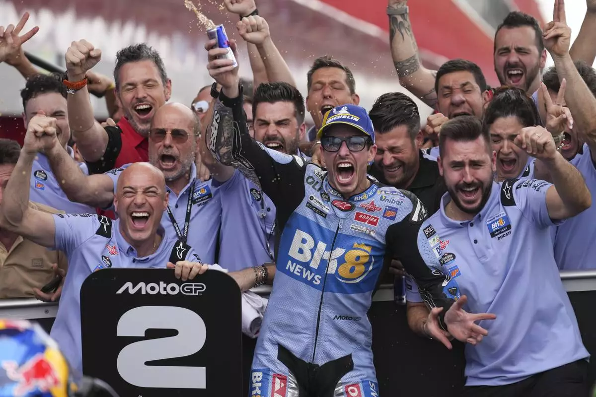 Spain's Alex Marquez of the BK8 Gresini Racing MotoGP Team, center, celebrates finishing second place at the MotoGP race in Termas de Rio Hondo circuit, Argentina, Sunday, March 16, 2025. (AP Photo/Gustavo Garello)