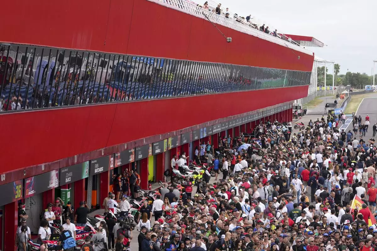 Spectators visit the pit line prior to the MotoGP race in Termas de Rio Hondo, Argentina, Sunday, March 16, 2025. (AP Photo/Gustavo Garello)