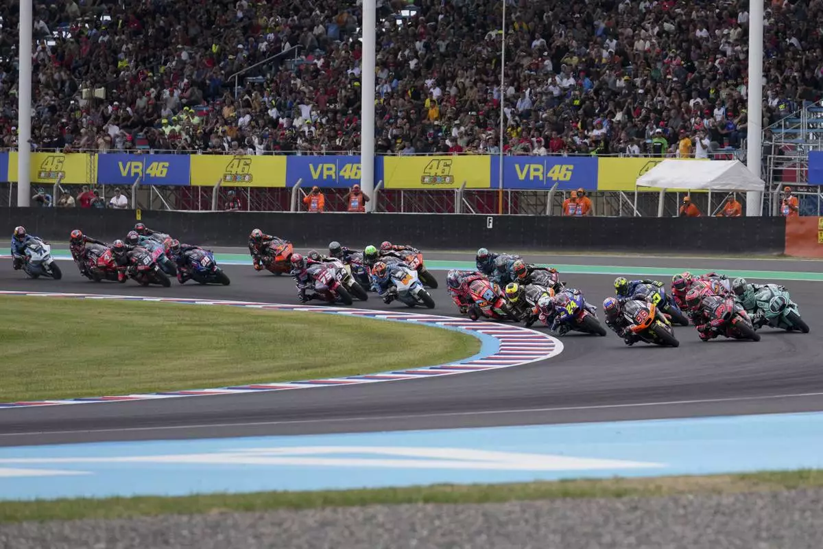 Riders speed at the start of the Moto2 race in Termas de Rio Hondo circuit, Argentina, Sunday, March 16, 2025. (AP Photo/Gustavo Garello)