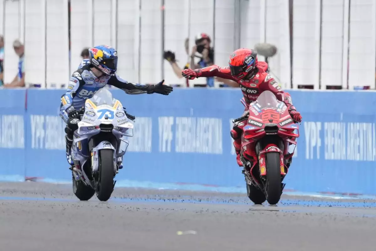 MotoGP race winner Spain's Marc Marquez of the Ducati Lenovo Team, left, celebrates with second place Spain's Alex Marquez of the BK8 Gresini Racing MotoGP Team in Termas de Rio Hondo circuit, Argentina, Sunday, March 16, 2025. (AP Photo/Gustavo Garello)