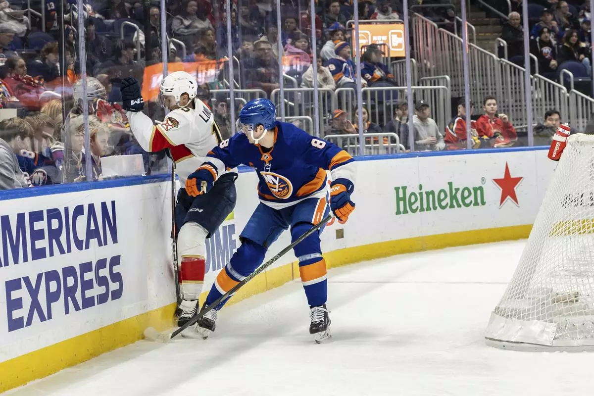 New York Islanders defenseman Noah Dobson (8) slams Florida Panthers center Anton Lundell, left, during the first period of an NHL hockey game, Sunday, March 16, 2025, in Elmont, N.Y. (AP Photo/Stefan Jeremiah)