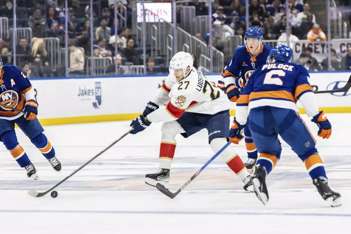 Florida Panthers center Eetu Loustarinen (27) controls the puck during the first period of an NHL hockey game against the New York Islanders, Sunday, March 16, 2025, in Elmont, N.Y. (AP Photo/Stefan Jeremiah)